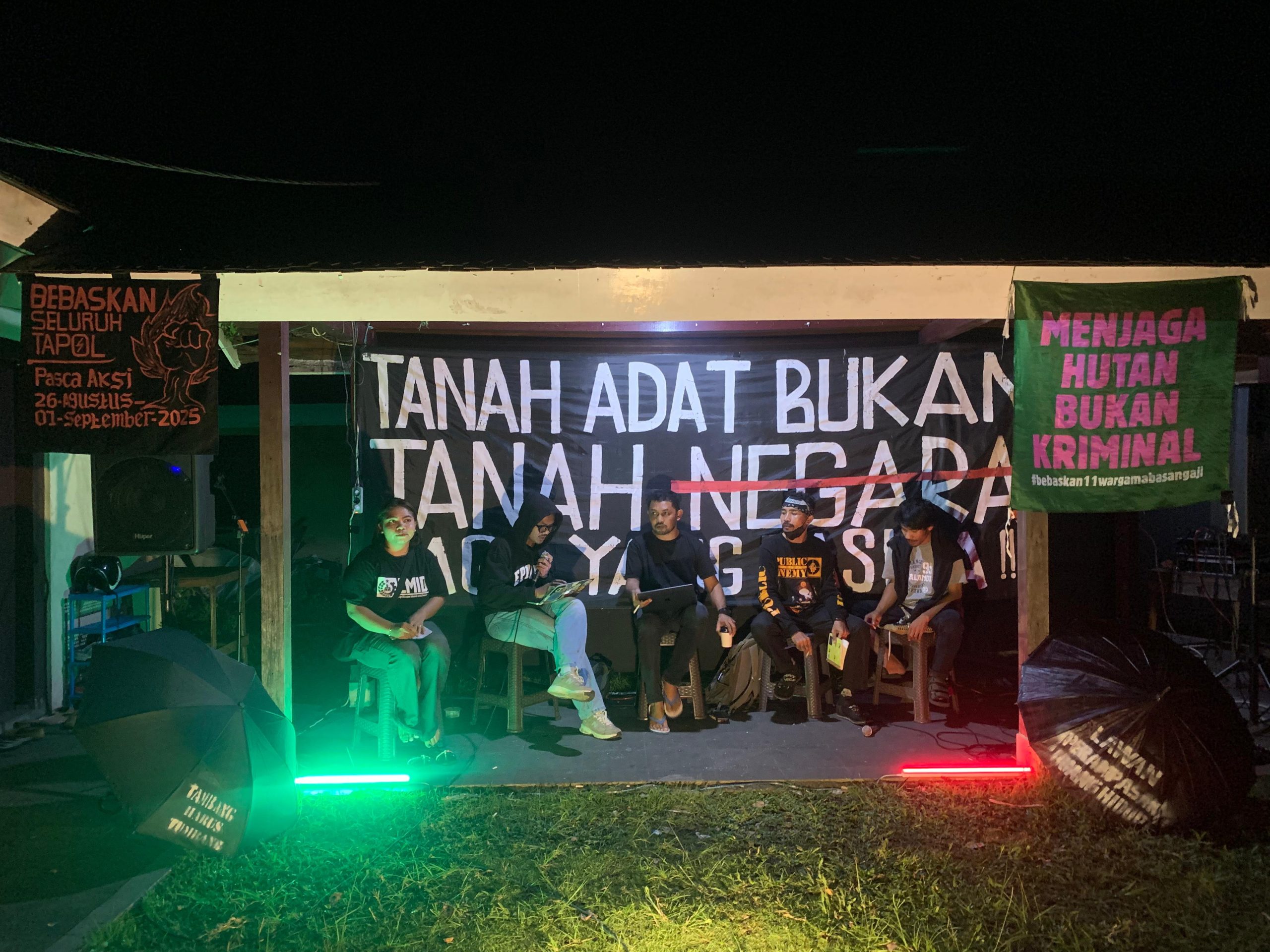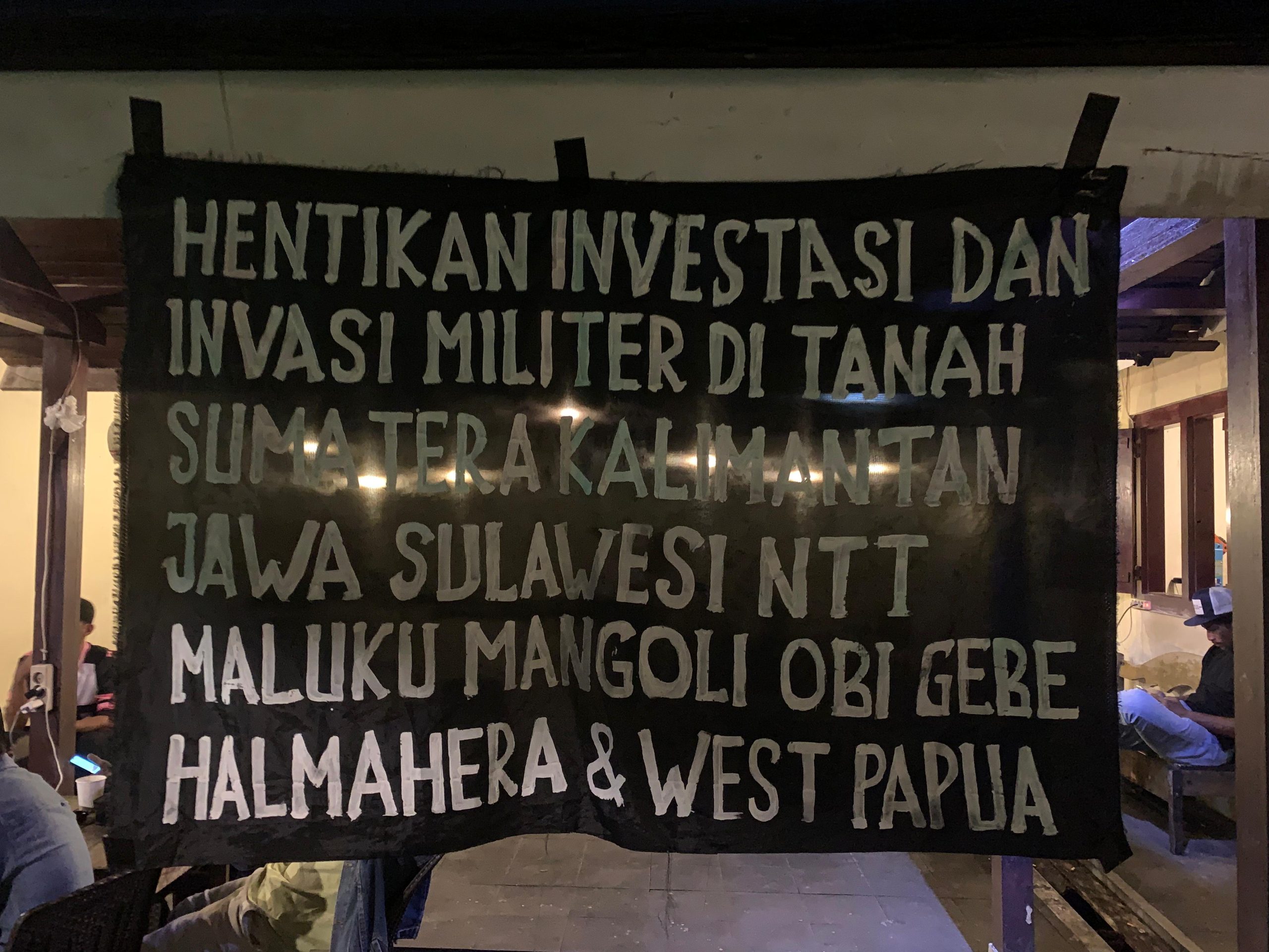 Lingkar.co.id—Spanduk-spanduk bertuliskan tanah adat bukan milik tanah negara dan pangan bukan tambang melekat di setiap sisi Coffee Sua. Anak muda dan aktivis lingkungan duduk bersila, menggunakan kursi menghadap ke arah timur. Para aktivis itu menghadiri Diskusi dan Launching Zine Maba Sangaji yang berlangsung di Benteng Oranje, Selasa malam (16/12/2025).