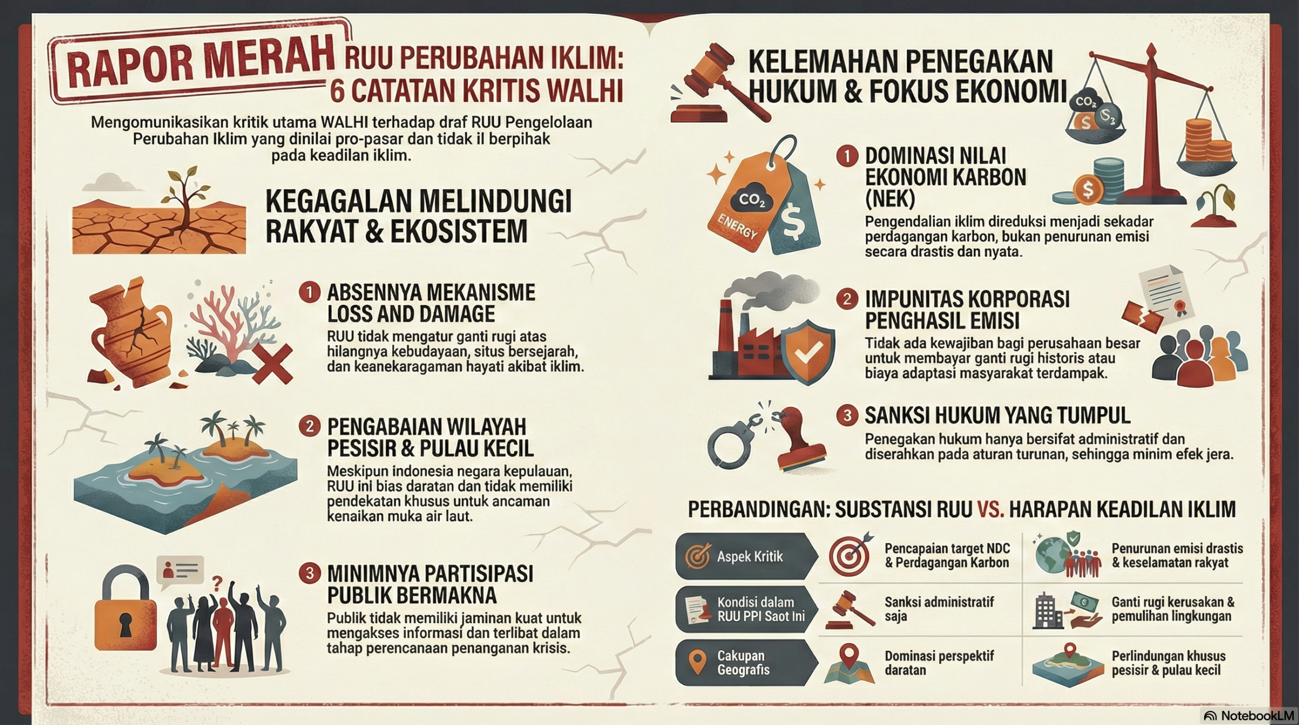 Patria menyatakan, WALHI memiliki enam catatan kritis atas draf RUU Pengelolaan Perubahan tersebut. Pertama, RUU PPI menunjukkan absennya paradigma krisis dan kegagalan negara dalam mengakui bahwa perubahan iklim telah menciptakan ketidakadilan struktural.