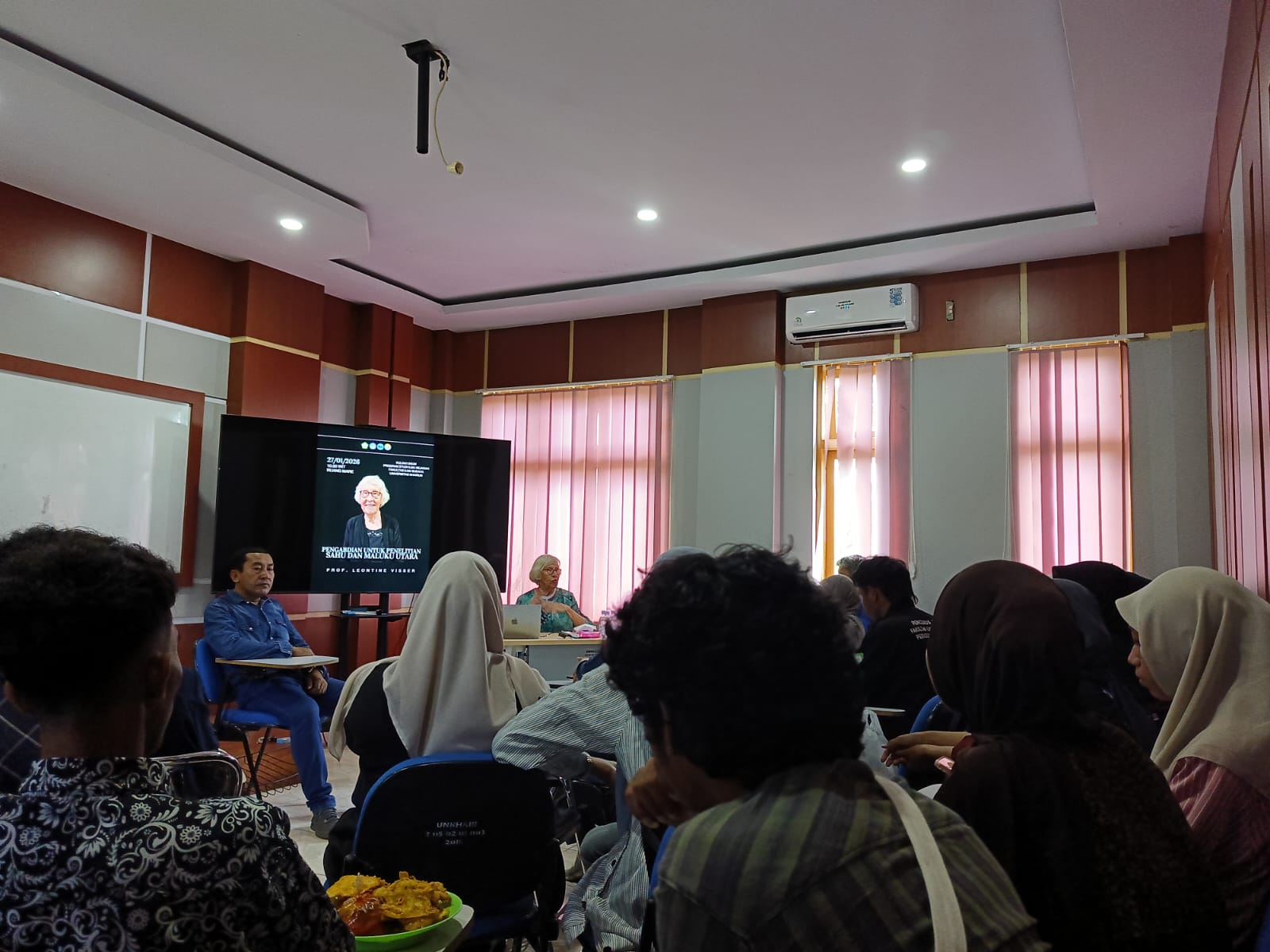 Lingkar.co.id—Program Studi Ilmu Sejarah, Fakultas Ilmu Budaya (FIB) Universitas Khairun (Unkhair) menggelar kuliah umum bertaraf Internasional. Kuliah umum ini menghadirkan Prof. Liontine E. Visser, Guru Besar Emeritus Wageningen University, Belanda. Kegiatan ini berlangsung di Ruang Mare, Fakultas Ilmu Budaya Unkhair, Kampus II Gambesi, Selasa (27/1/2026).